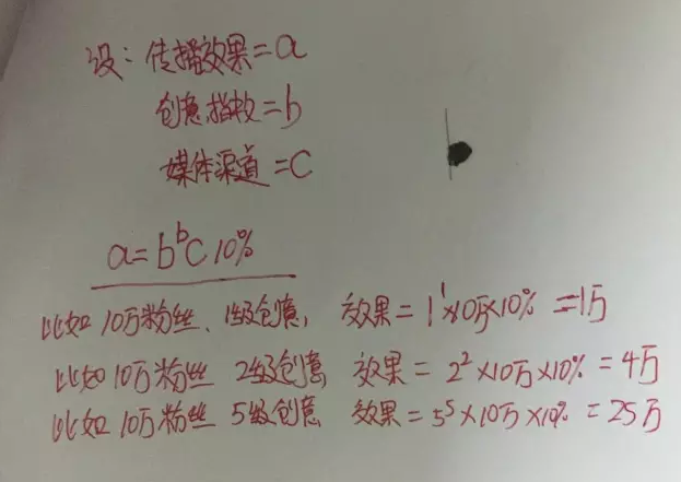 比如,創(chuàng)意指數(shù)為1,覆蓋粉絲數(shù)為10萬,那么傳播效果=1×1×10萬×10%=1萬