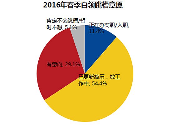 與2014年春季及2015年春秋兩季的調(diào)查結(jié)果相比,2016年春季白領(lǐng)跳槽意愿更加強(qiáng)烈,雖然已經(jīng)跳槽成功的白領(lǐng)比例基本一致,但已經(jīng)開始尋找新工作的白領(lǐng)比例大大增加。已經(jīng)有11.4%的白領(lǐng)開始辦理離職及入職手續(xù),超過一半的白領(lǐng)已經(jīng)開始行動起來,暫時只有想法還沒行動的白領(lǐng)占比為29.1%??隙ú粫鄣谋壤齼H為5.1%。