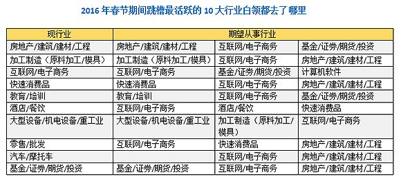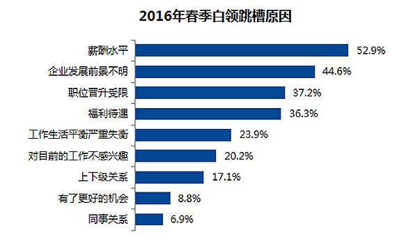 不過,隨著2016年中國人才雇傭市場逐漸回歸理性,大多數(shù)白領(lǐng)的跳槽選擇趨向保守,在現(xiàn)有行業(yè)中尋找發(fā)展前景更好的下家成為主流。
